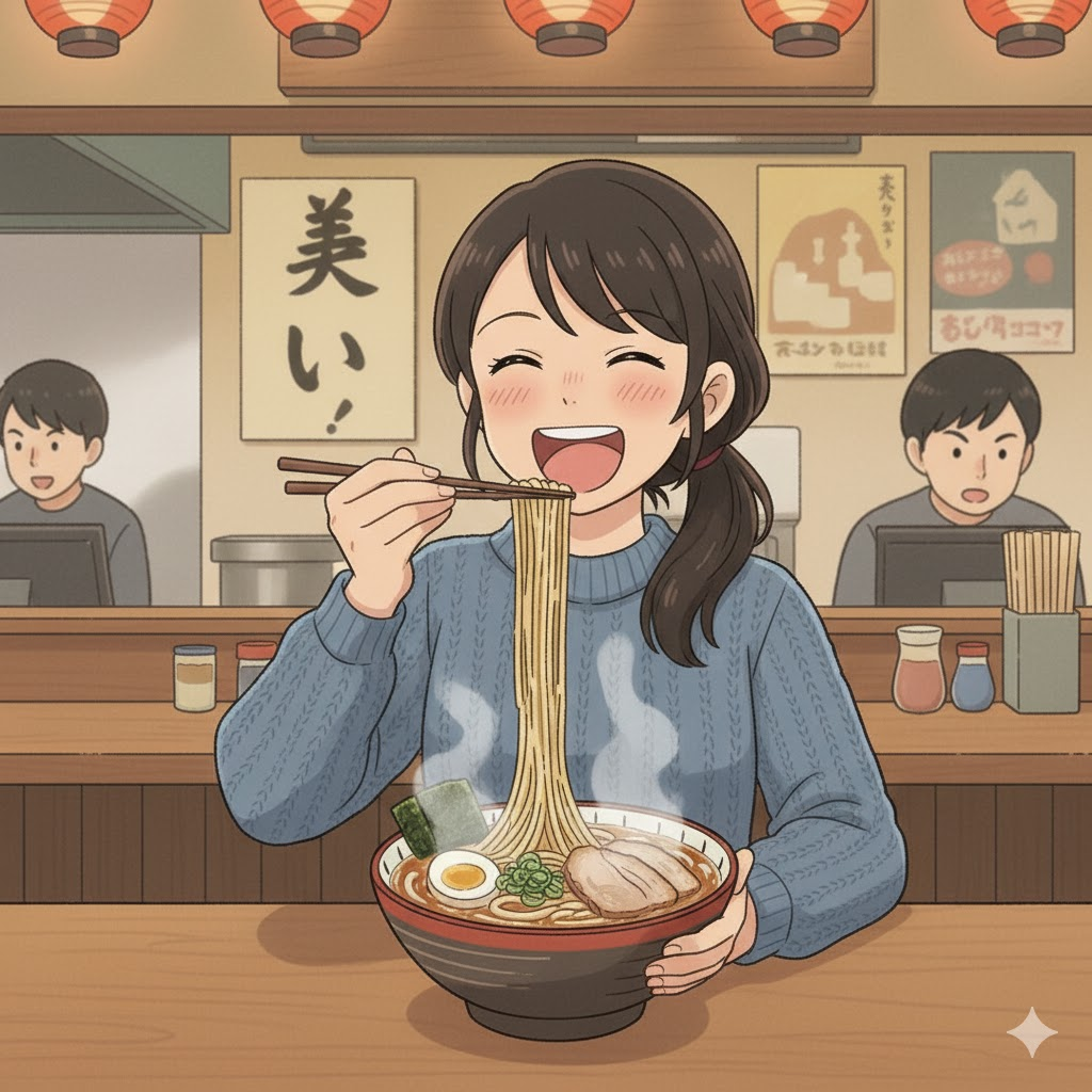 B:ズズッと音を立てて食べるのが日本流だよ!