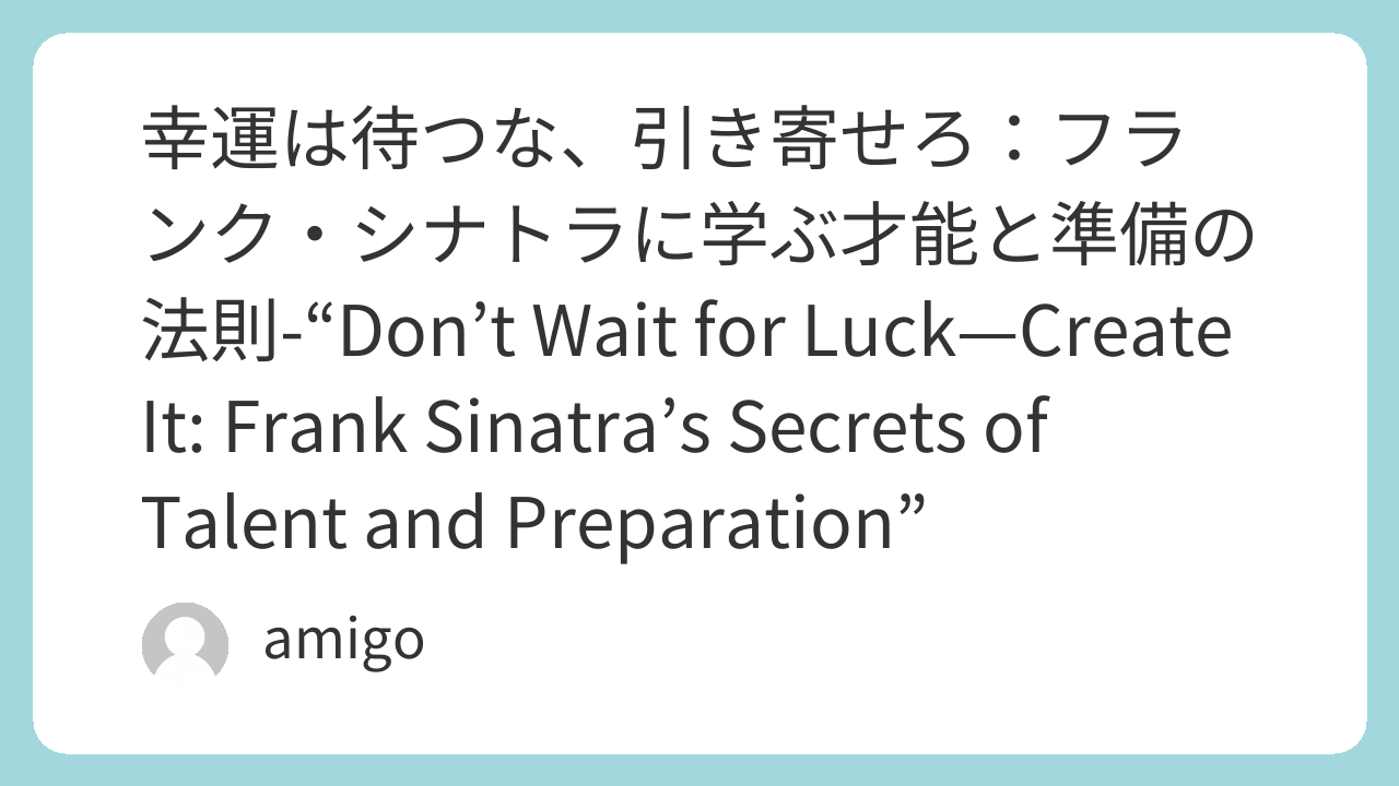 フランク・シナトラの言葉は、成功の原則を非常にシンプルに示しています。「才能の発見」と「準備」。この二つが揃ったとき、目の前に現れたチャンスを逃さず掴み取ることができ、それが結果的に幸運として語られるのです。今日から、自分が持っている光を意識し、それをいつでも使えるように磨き続けることから始めてみませんか。