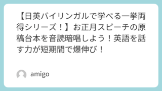 自己啓発 【日英バイリンガルで学べる一挙両得シリーズ!】🎍お正月スピーチの原稿台本を音読暗唱しよう!英語を話す力が短期間で爆伸び! 🎍 お正月スピーチ前書き(音読&暗唱用スラッシュ版) 日本語版(音読用スラッシュ区切り)みなさん、こんにちは。 /お正月は / 新しい年の始まりであり、 / 目標や希望を考える大切な時期です。 /このスピーチ原稿を通して、 / 皆さんには英... 2025.09.26 自己啓発英語学習