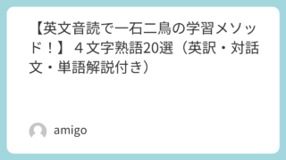 自己啓発 【英文音読で一石二鳥の学習メソッド!】4文字熟語20選(英訳・対話文・単語解説付き) 前書き英語学習において、音読はただの発音練習ではありません。文章のリズムや構造を体で覚え、自然に英語を理解し、表現力を高める方法です。この教材では、日本語の4文字熟語20選 を使い、例文と対話文を英訳付きでまとめました。さらに、スラッシュで... 2025.09.30 自己啓発英語学習