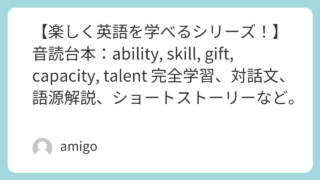 自己啓発 【楽しく英語を学べるシリーズ!】📘 音8行でまとめる完全学習、対話文、語源解説、ショートストーリーなど。 はじめに英語には「できる力」を表す単語が数多く存在します。その中でも ability, skill, gift, capacity, talent は、よく似ているようで微妙にニュアンスが異なります。「生まれつきの才能」なのか、「練習で身に... 2025.09.15 自己啓発英語学習