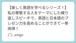 自己啓発 【楽しく英語を学べるシリーズ!】私の尊敬する人をテーマにした繰り返しスピーチで、英語と日本語のプレゼン力を高めることができて一挙両得! はじめに人生で尊敬する人々から学ぶことは、私たちの生き方を形づくります。私には、深く尊敬している3人の特別な存在がいます。まず父は、努力と責任の大切さを教えてくれました。次に先生は、学ぶ楽しさと問い続けることの大切さを私に示してくれました。... 2025.09.16 自己啓発英語学習